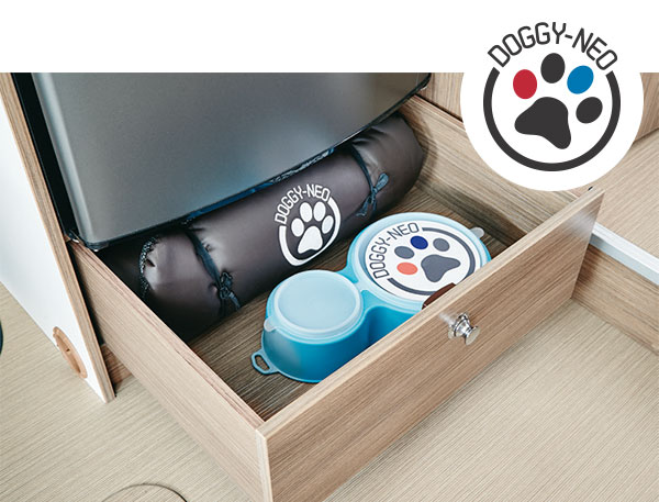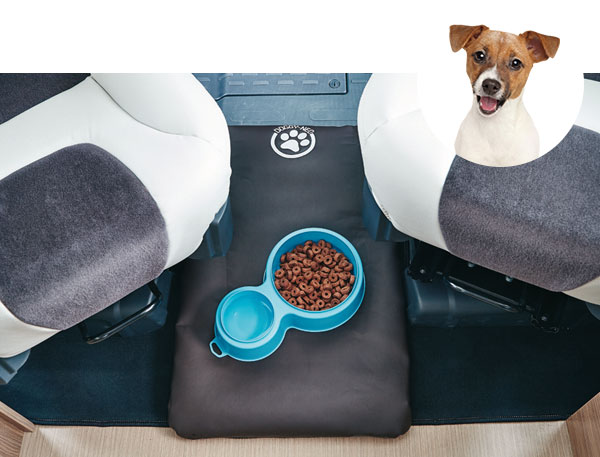 Kit composé d'une gamelle étanche pour l'eau et les croquettes ainsi qu'un tapis.