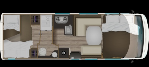 Séparé de l’avant du véhicule par une cloison de séparation, celui-ci est doté de deux lits superposés transversaux. Une dinette avec banquettes face à face permettra à vos enfants de disposer de leur propre espace.